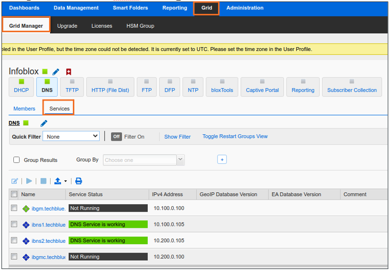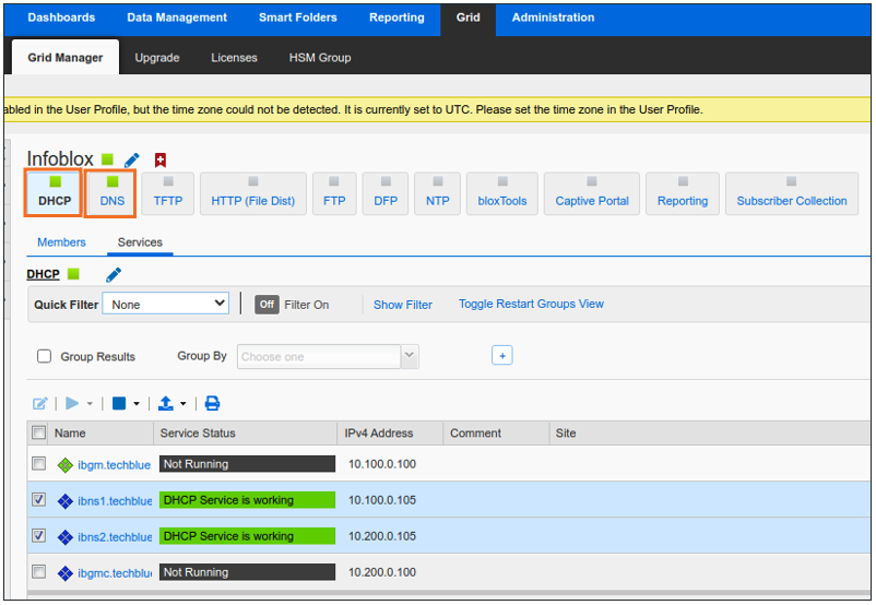 Users have reported trouble receiving DHCP or DNS services from the grid member ibns2.techblue.net. Please verify that both services are running on this NIOS member.