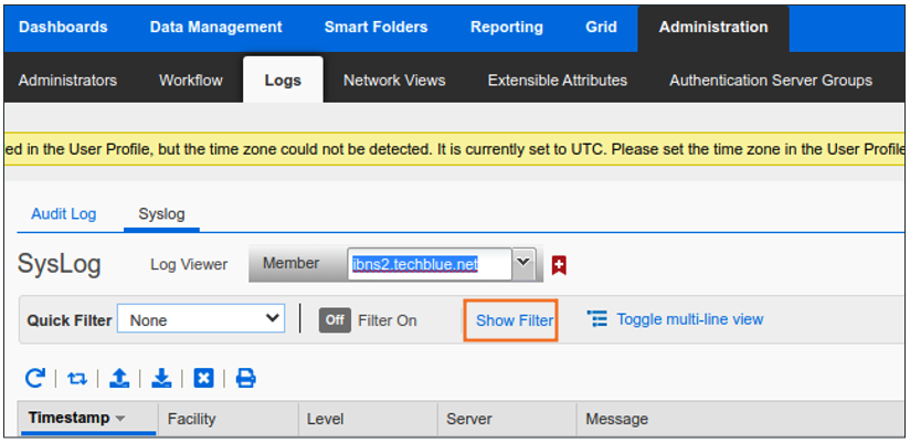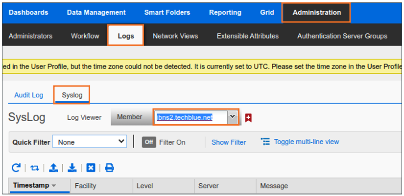 Navigate to Administration → Logs → Syslog