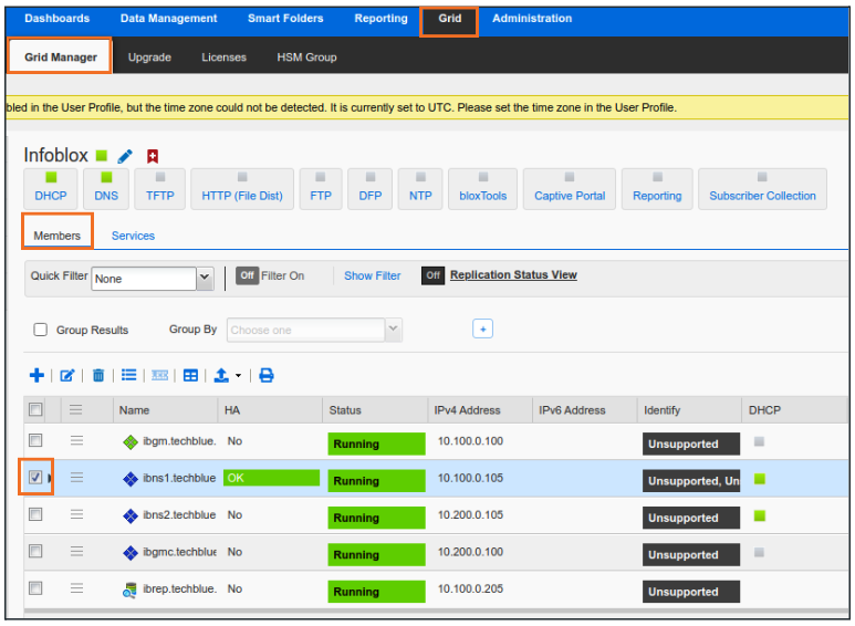 Choose a member (example shows ibns1.techblue.net) by checking the box to the left of the member name.