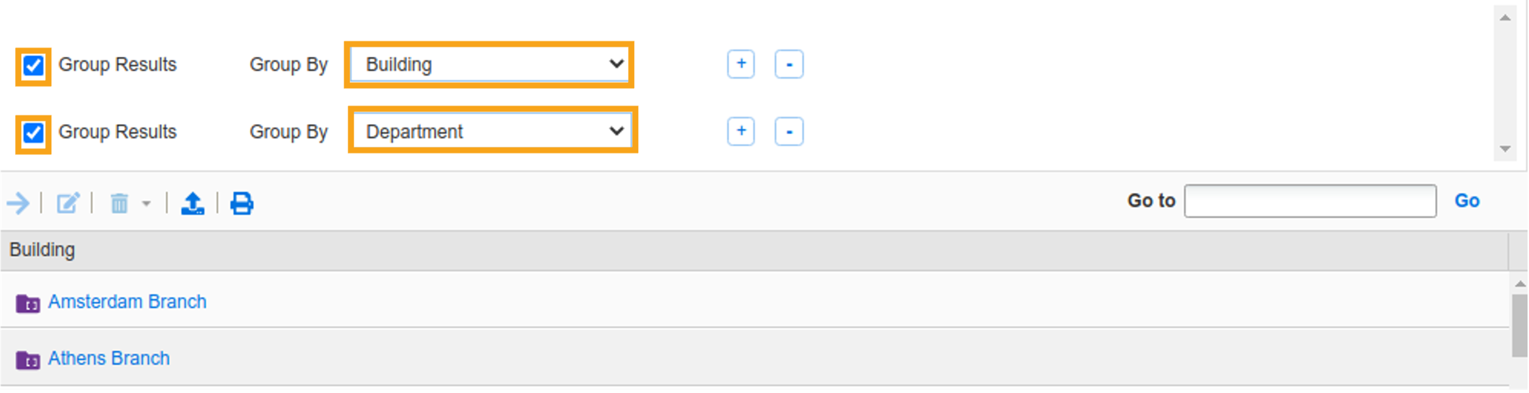 Check the checkbox labeled Group Results, select Building from the Group By dropdown, and click the +