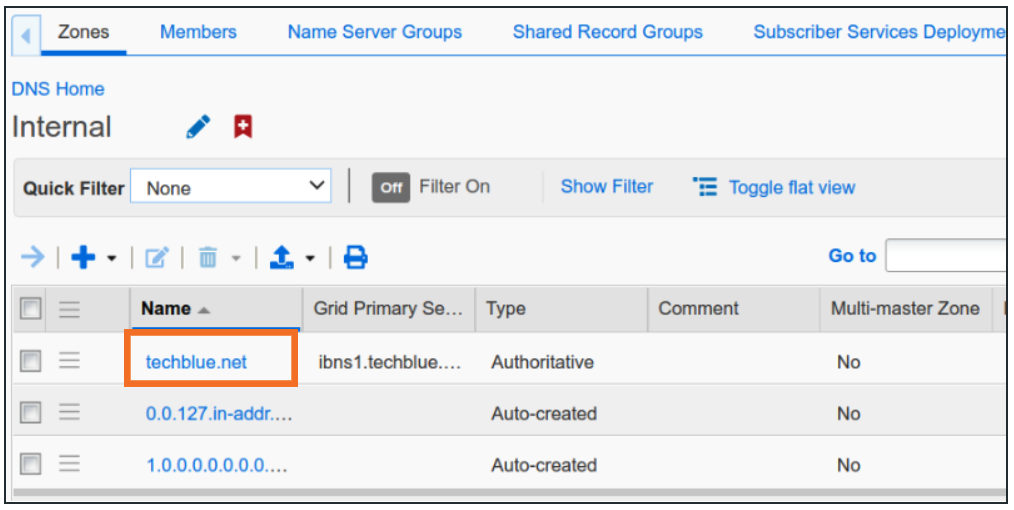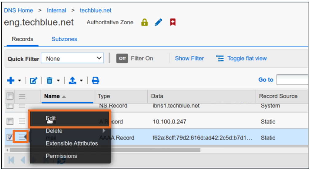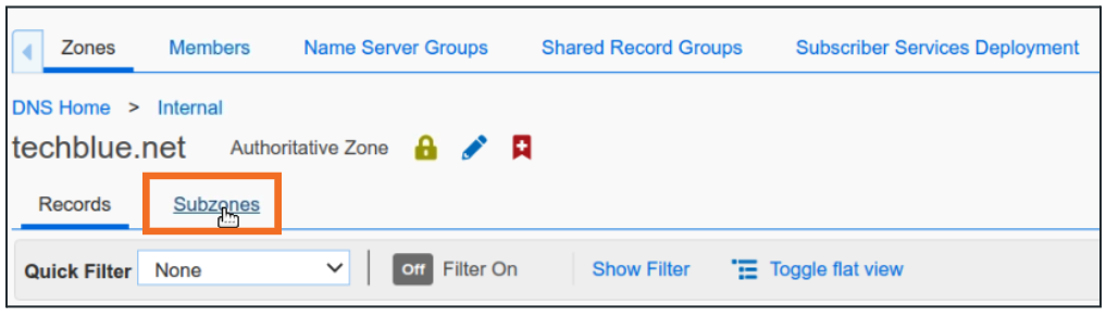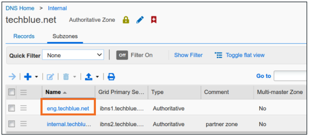 eng.techblue.net is a subzone of techblue.net. Inside the Internal View, click techblue.net to open the zone