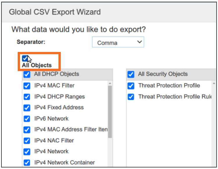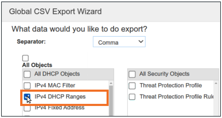 Scroll down the list of objects and check the box for IPv4 DHCP Ranges
