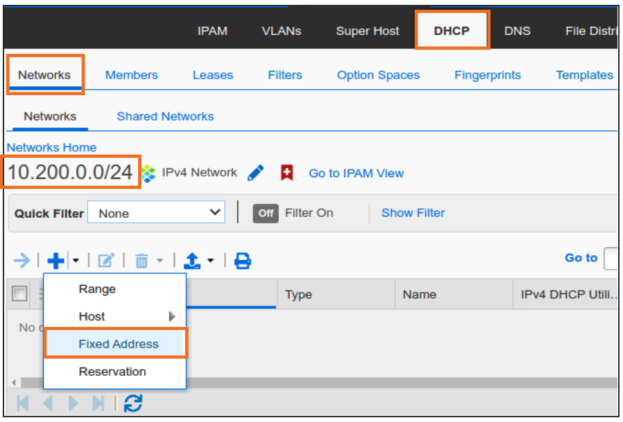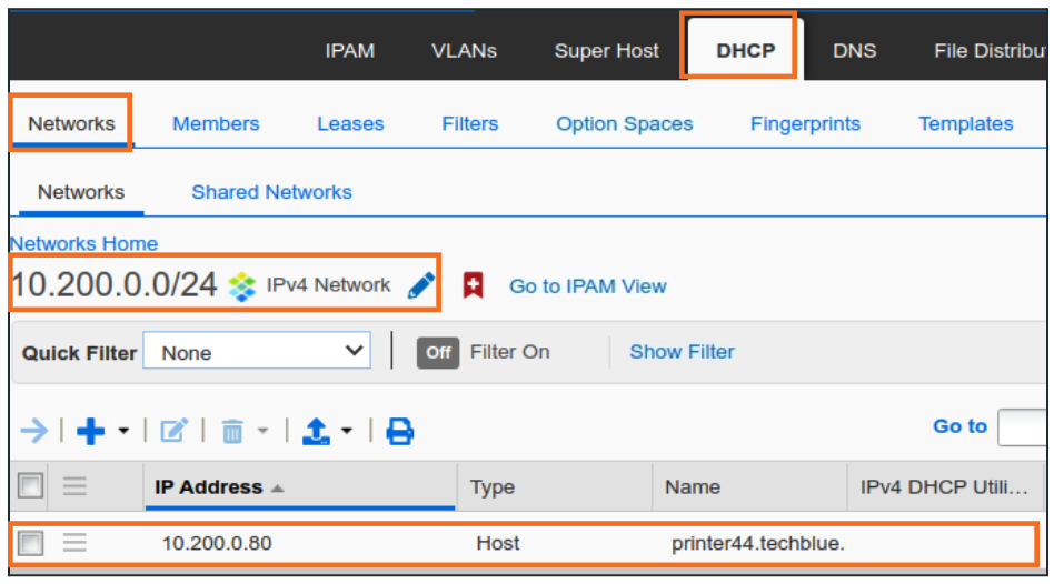 Since we had checked the box for DHCP, we can find the Host record under Data Management → DHCP → Networks under the 10.200.0.0/24 network object