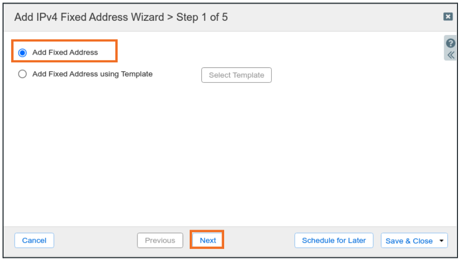 In Step 1 of 5, choose Add Fixed Address and click Next