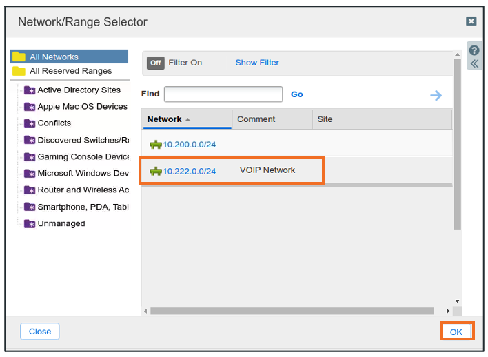 Click on the previously identified network provisioned for VOIP (10.222.0.0/24) and click OK
