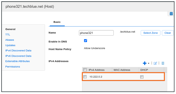 Assuming there are no conflicts with existing data, please create the appropriate object or objects so the name phone321.techblue.net is assigned to the appropriate IP address.