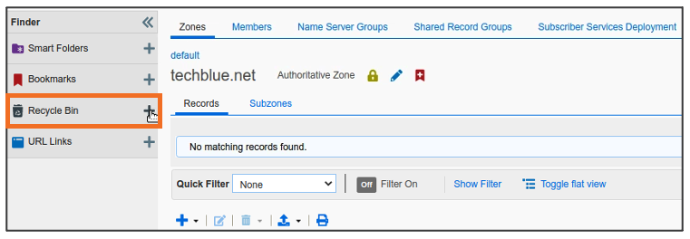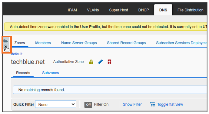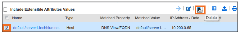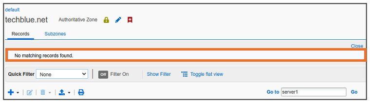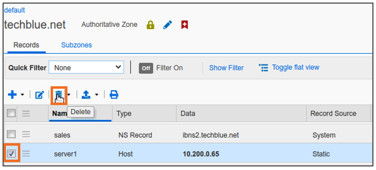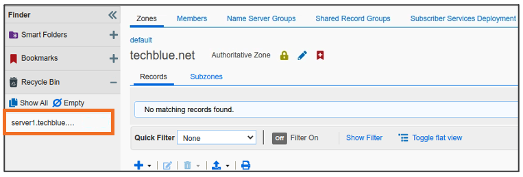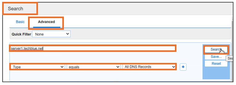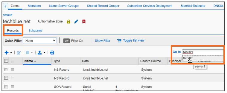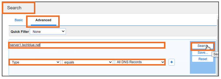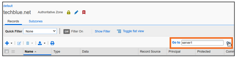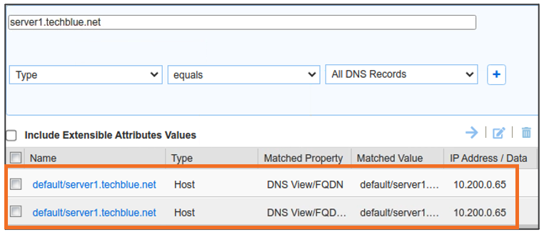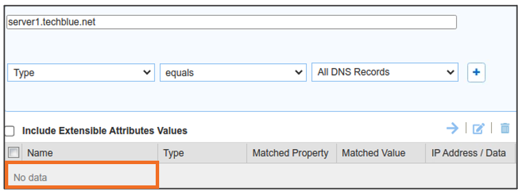 Global Search may confirm the same information. Navigate to Global Search → Advanced and provide server1.techblue.net as a search string then click Search for Type equals All DNS Records