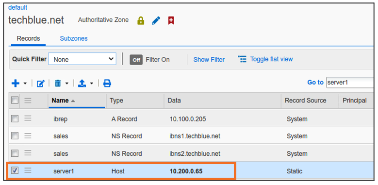 The results show that there is now a Host Record with the name server1.techblue.net and it has the IP Address 10.200.0.65.