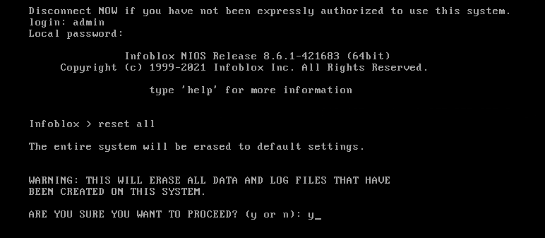 Log back into the NIOS-4 VM and validate that it has been reset by using the command
