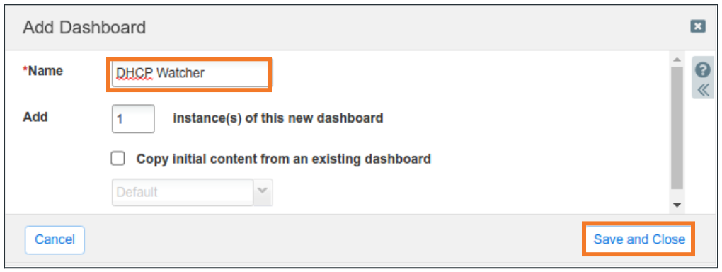 Name the Dashboard DHCP Watcher and click Save and Close