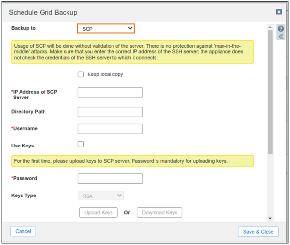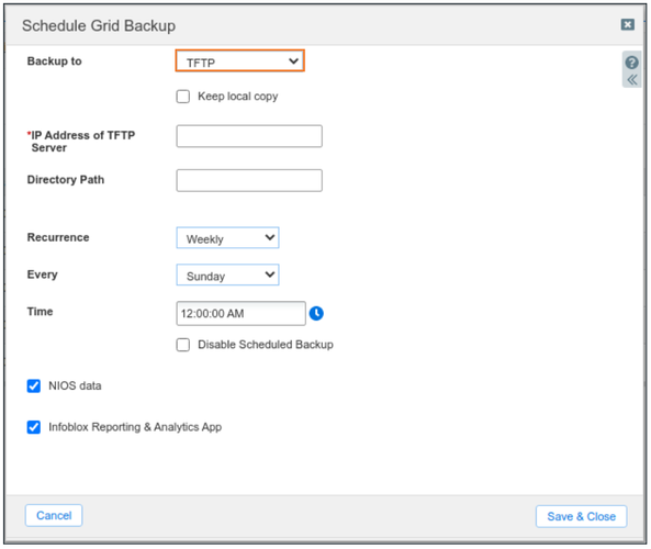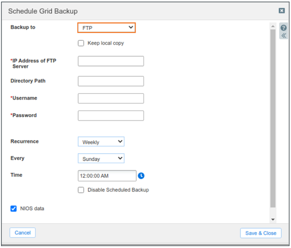 If backups have been configured to a remote server, the operation should show the backup destination and protocol used for file transfer. Here, backups have not been configured. We can double-check by switching between the different protocols available for file transfer out of NIOS and check whether the configuration is present for TFTP, FTP or SCP. Screenshots below show configuration for each of the 3 supported protocols:
