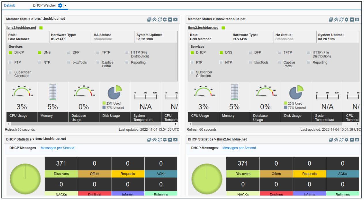 From the GM web interface. Create a new Status Dashboard named DHCP Watcher. In the new dashboard, add the content DHCP Statistics and Member Status for both members ibns1 and ibns2. To receive near real-time updates be sure to enable auto-refresh. The result should have four (4) widgets displayed on the screen, clearly showing the DHCP service statistics (such as number of requests) and System Status (such as CPU and memory usage).