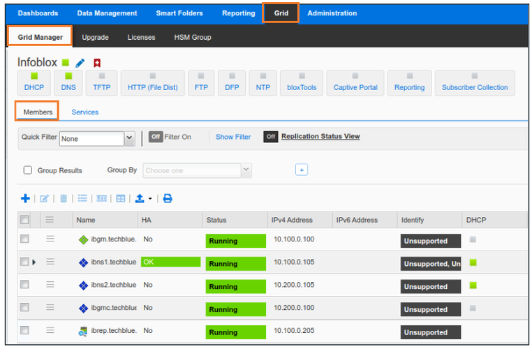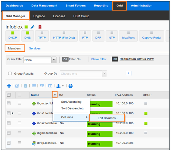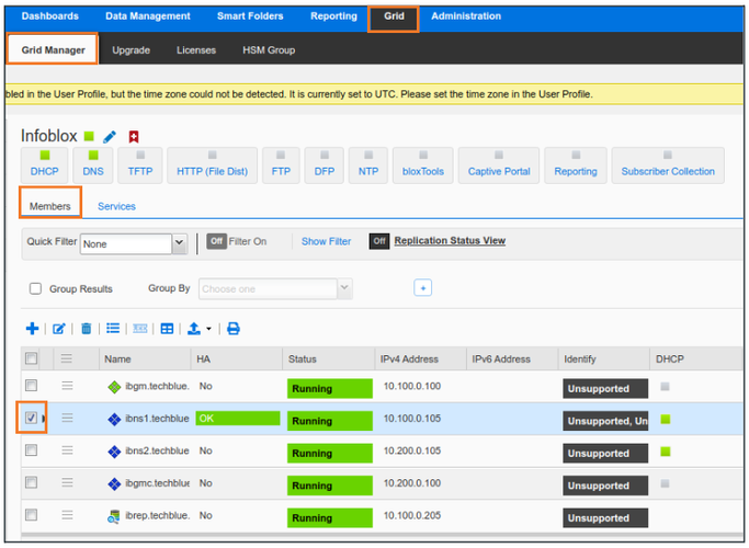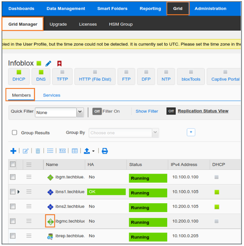 Service Status Check: Users have reported trouble receiving DHCP or DNS services from the grid member ibns2.techblue.net. Please verify that both services are running on this NIOS member.