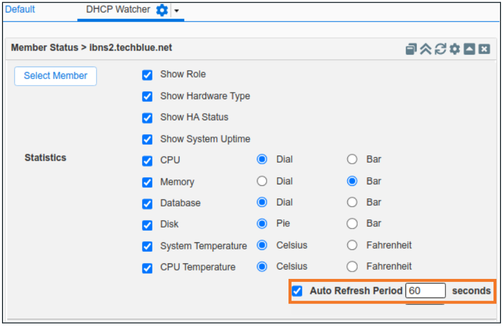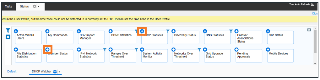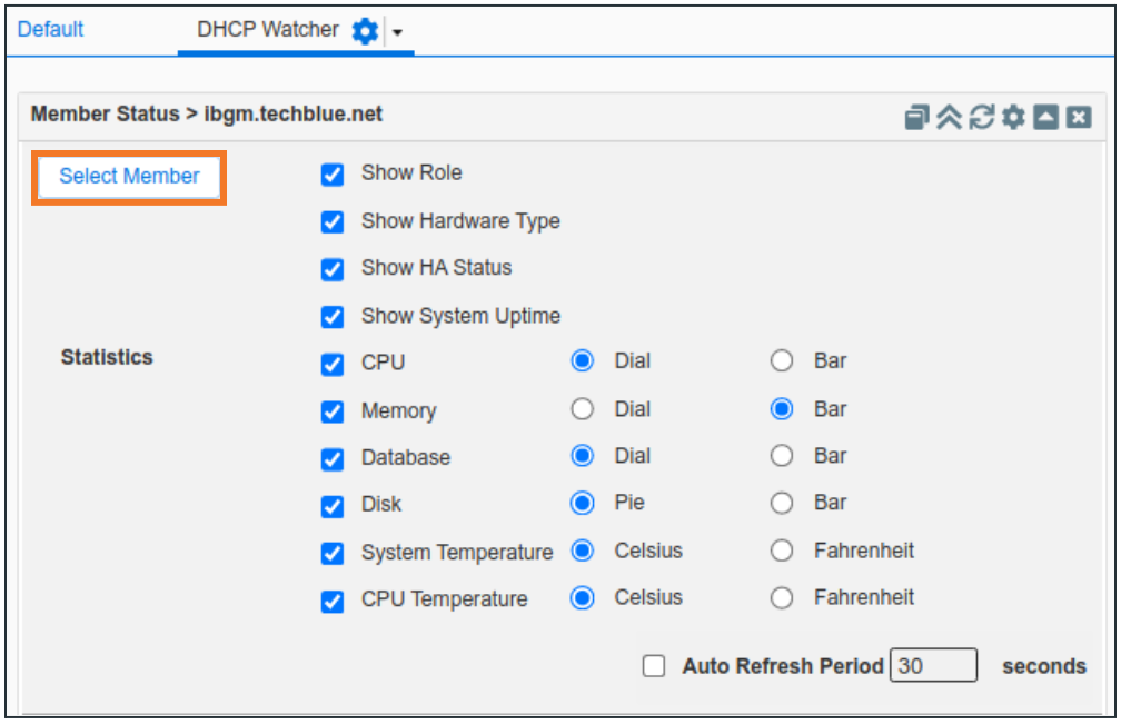 From the content list, add Member Status and DHCP Statistics by dragging them into the Dashboard or by clicking the +