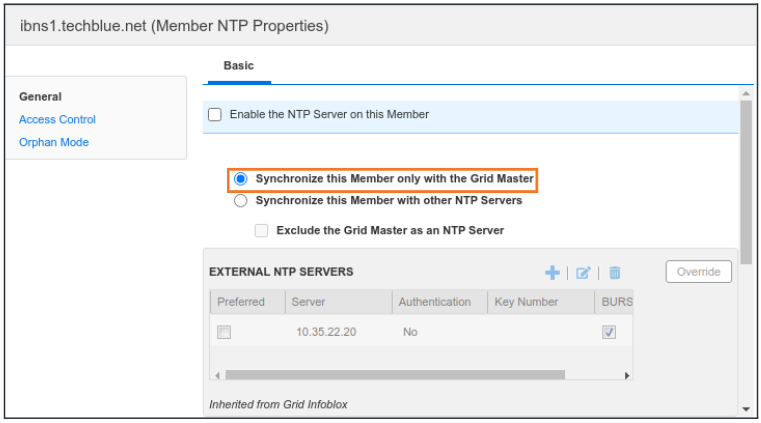The members, by default, synchronize their clocks with the GM unless specifically configured otherwise. We can double check this from the GUI and verify the NTP configuration for each Grid Member (ibgm, ibgmc, ibns1, ibns2, and ibrep).