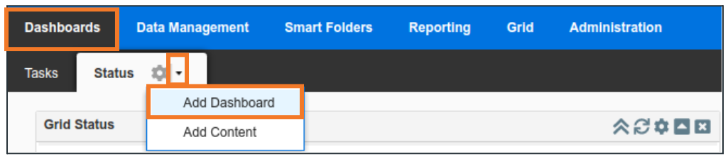 Click on the dropdown button next to the Dashboard name and choose Add Content
