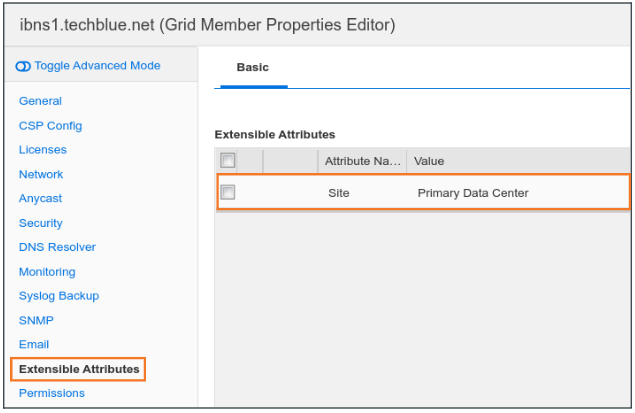 “Primary/Secondary Data Center” is not a default attribute in NIOS, so it is safe to assume that this information is stored as an extensible attribute value. There are a couple of ways to find which Extensible attribute of the Grid Member holds this value.