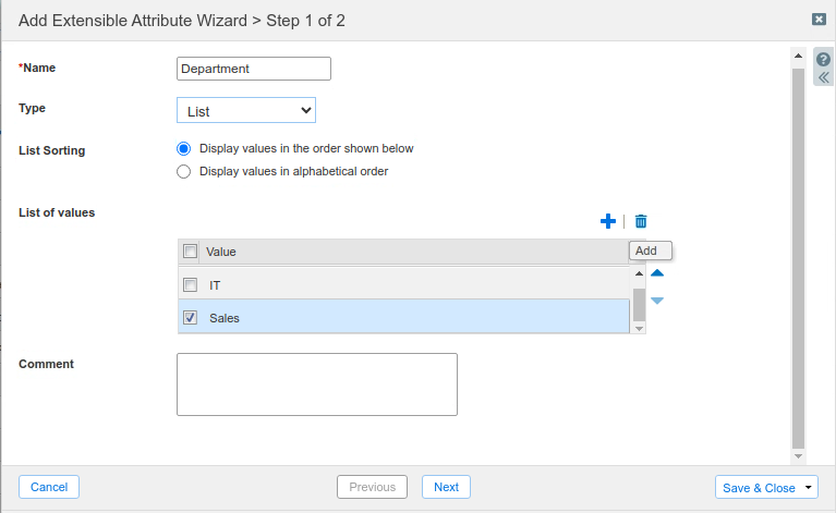 To add the values, click the Add button and enter the first department name in the Value