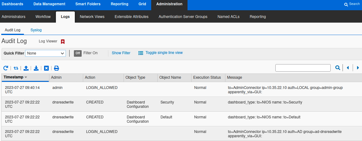 The sample screenshot below shows a successful login by the user dnsreadwrite (lowest entry). The log message shows the user authenticated with AD (auth=AD), and was applied permissions from the group ad-dnsreadwrite (group=ad-dnsreadwrite). You can compare this to a local login in the first message, where the user admin authenticated with the local user database.