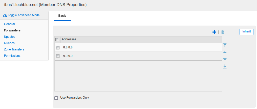 Use Forwarders Only. This checkbox controls the behavior of the NIOS member whether or not to fall back to using the DNS root servers for name resolution. When this box is checked, NIOS will only use the forwarder(s) defined in the section above. When this box is unchecked, NIOS will prefer the forwarder(s) defined above and fall back to using the root servers if needed. In this scenario, since we are forwarding to external or public IP addresses, this implies the NIOS members already have Internet access. Thus, it makes sense to assume that if the forwarders (8.8.8.8 and 9.9.9.9 in this case) become unreachable, the NIOS members (ibns1 and ibns2) has the ability to fall back to querying the root servers directly.