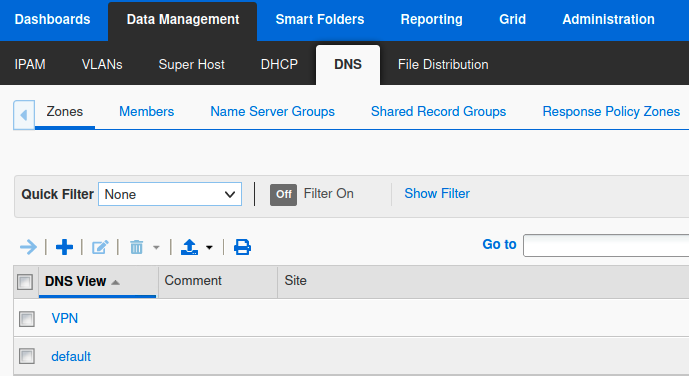 The display under Data Management → DNS → Zones is now updated to show the 2 DNS views: VPN and default.