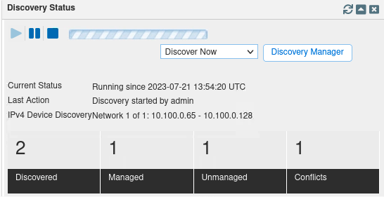Find the Discovery Status widget. It displays the current progress of discovery, including the number of discovered, managed, unmanaged, and conflict IP addresses in the network.