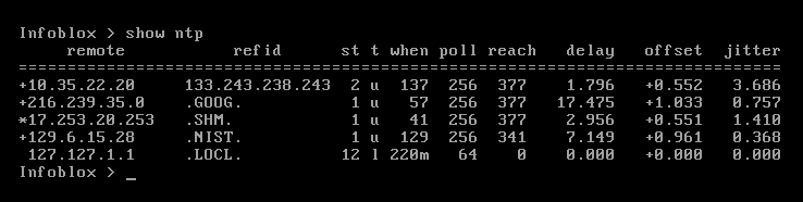 In this example, the GM's time is synchronized with stratum 1 server 17.253.20.253 (noted by the * symbol). The GM has made contact with other time servers (noted by the + symbol) and will use them for backup should the first NTP server is unreachable. 10.35.22.20 is a stratum 2 server, and 216.239.35.0 and 129.6.15.28 are both stratum 1 servers.