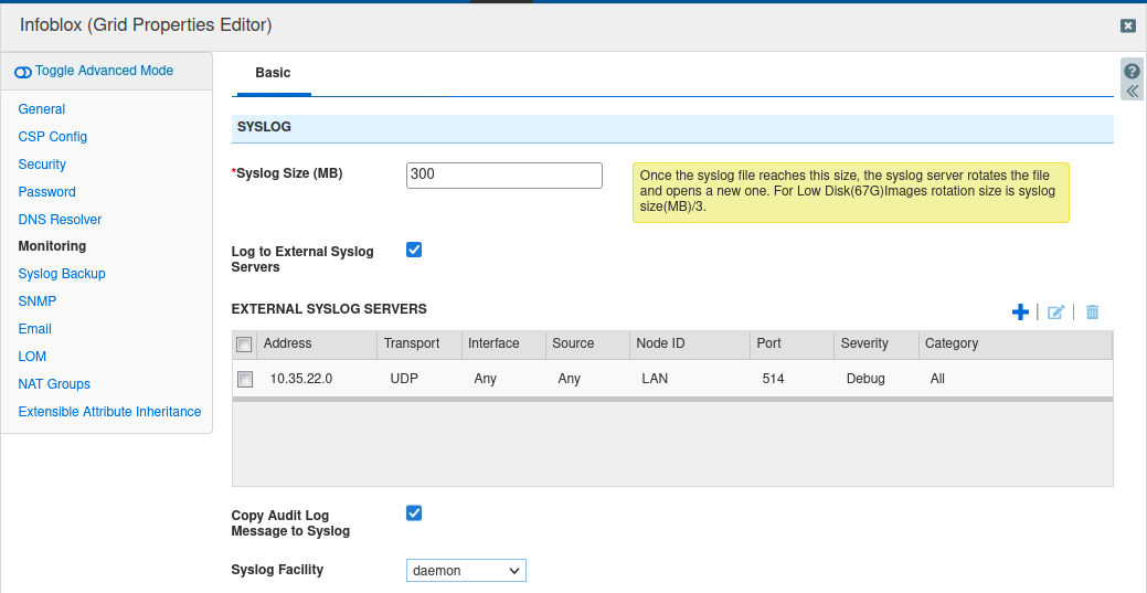 Configuring External Syslog Settings: Configure the Grid to send syslog messages by UDP to your support-server: 10.35.22.20.