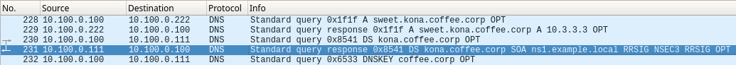 If you chose to read the packet capture file 2602-task1-ada.pcap, packet #230 shows ADA querying for the DS record of kona.coffee.corp, and packet #231