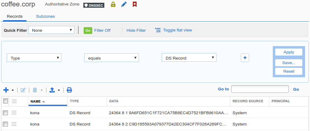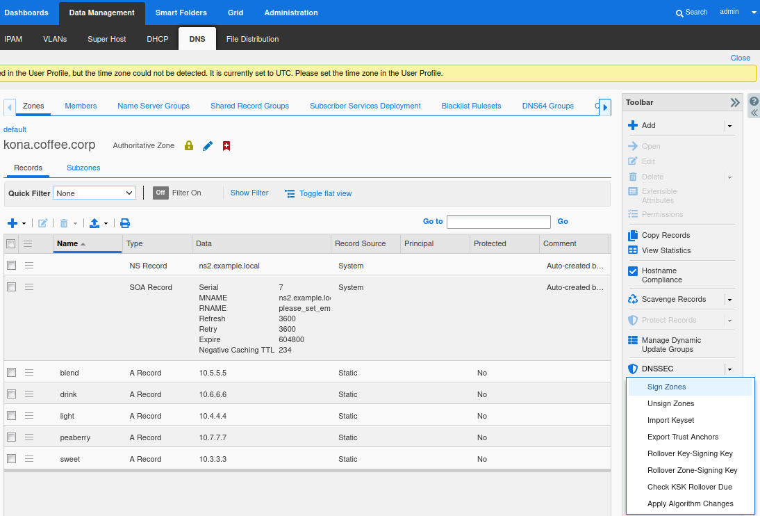 Navigate to Data Management → DNS → Zones, click on kona.coffee.corp.