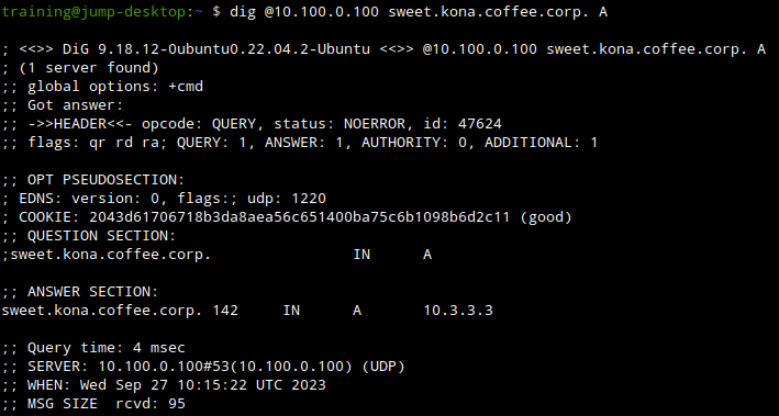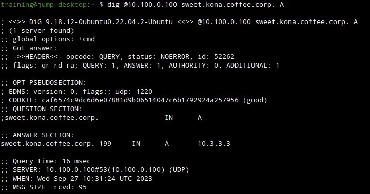 On the Jump-Desktop (10.35.22.10), query the recursive name server ADA (10.100.0.100) for the A record sweet.kona.coffee.corp.