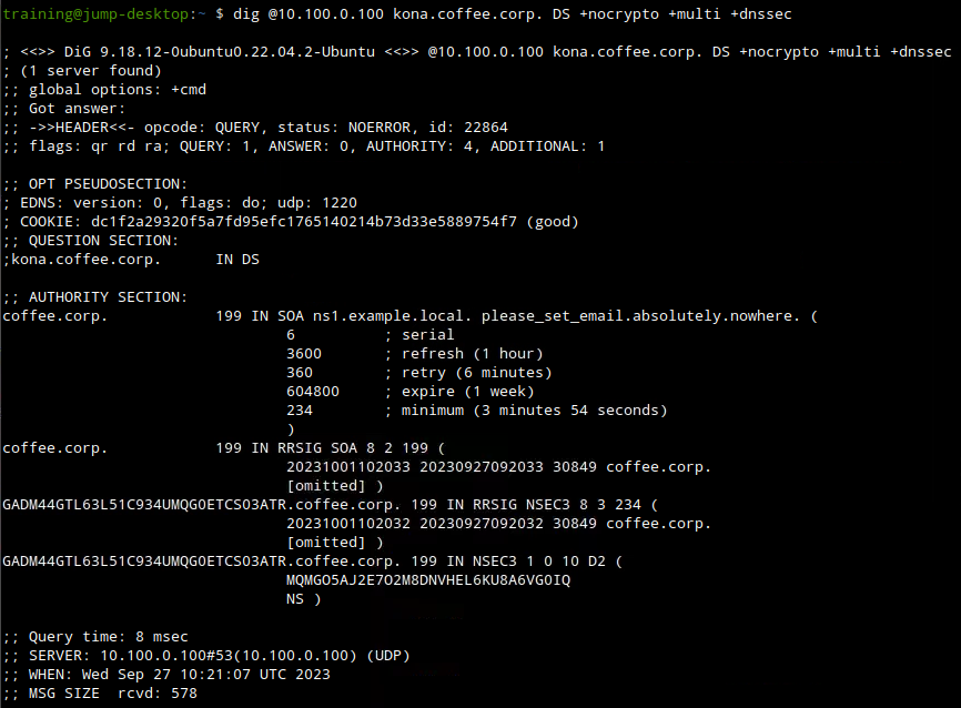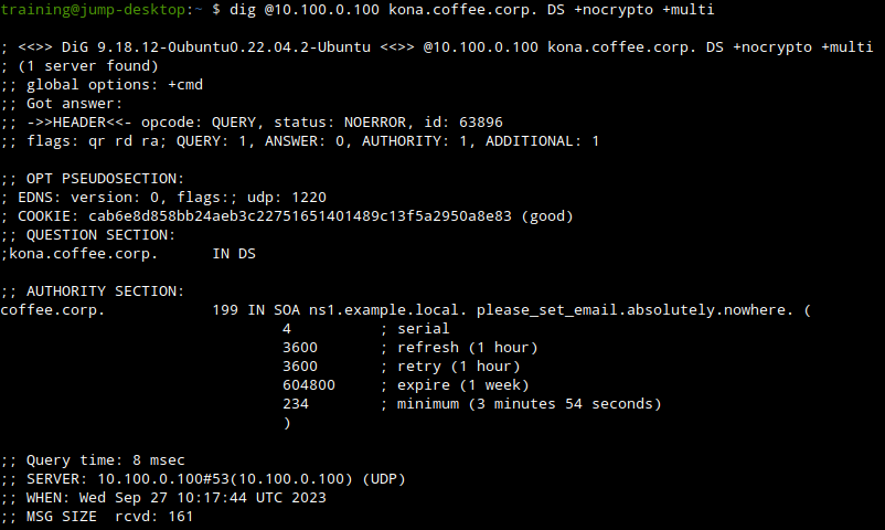 This more complete response shows that the parent domain coffee.corp name server responded, indicating there is no DS record for the domain kona.coffee.corp (NSEC3 is one of the two ways DNSSEC says NXDOMAIN). That is our root cause: because there is no DS record on the parent, the zone kona.coffee.corp is still being treated as insecure, as if the domain was not signed at all.