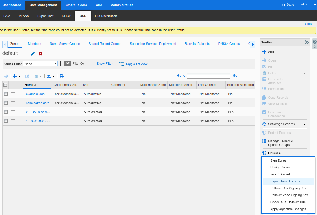 Login to NS2, navigate to Data Management → DNS → Zones, click on kona.coffee.corp. In the Toolbar, select DNSSEC → Export Trust Anchors