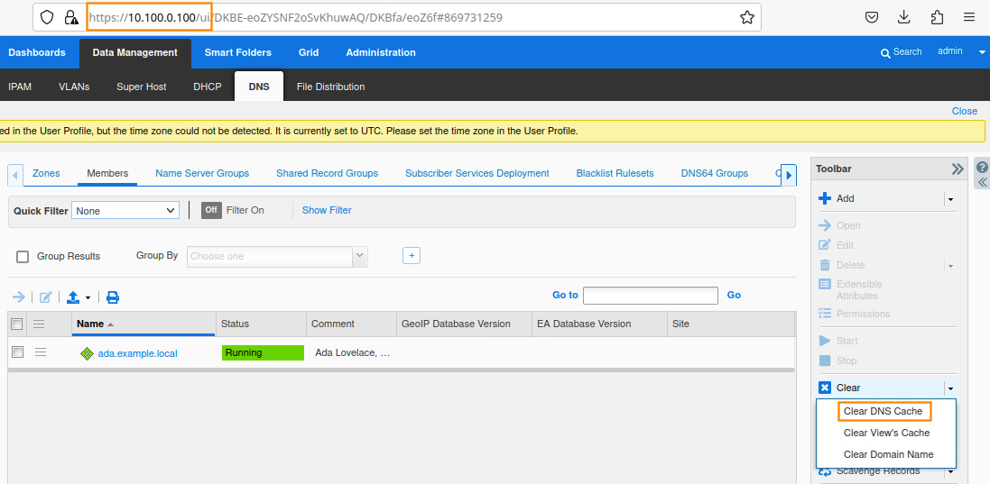 To clear cache, login to ADA (10.100.0.100), navigate to Data Management → DNS → Members, select the member ada.example.local, navigate to Toolbar → Clear → Clear DNS Cache, as shown here.