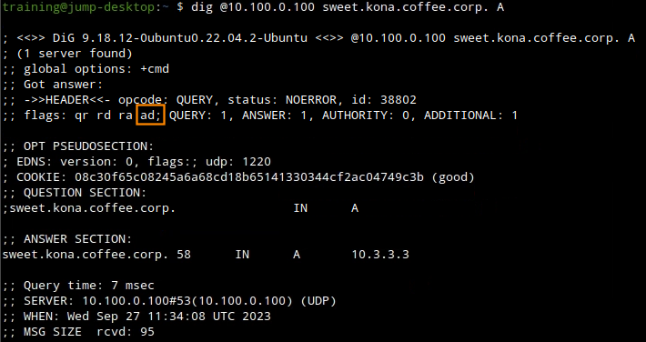 Test DNS resolution again for the A record sweet.kona.coffee.corp. Does the AD flag appear now? Why or why not? If not, what steps can be taken to make it appear?