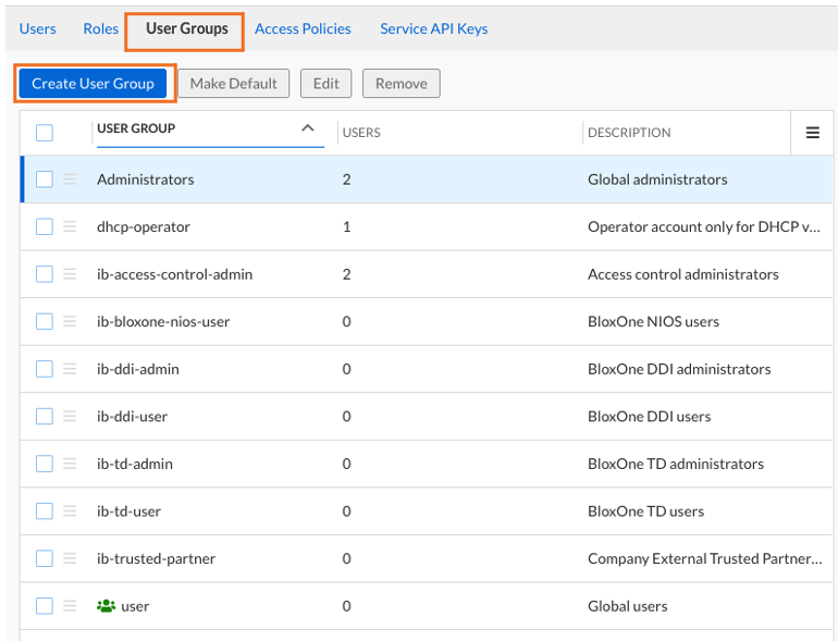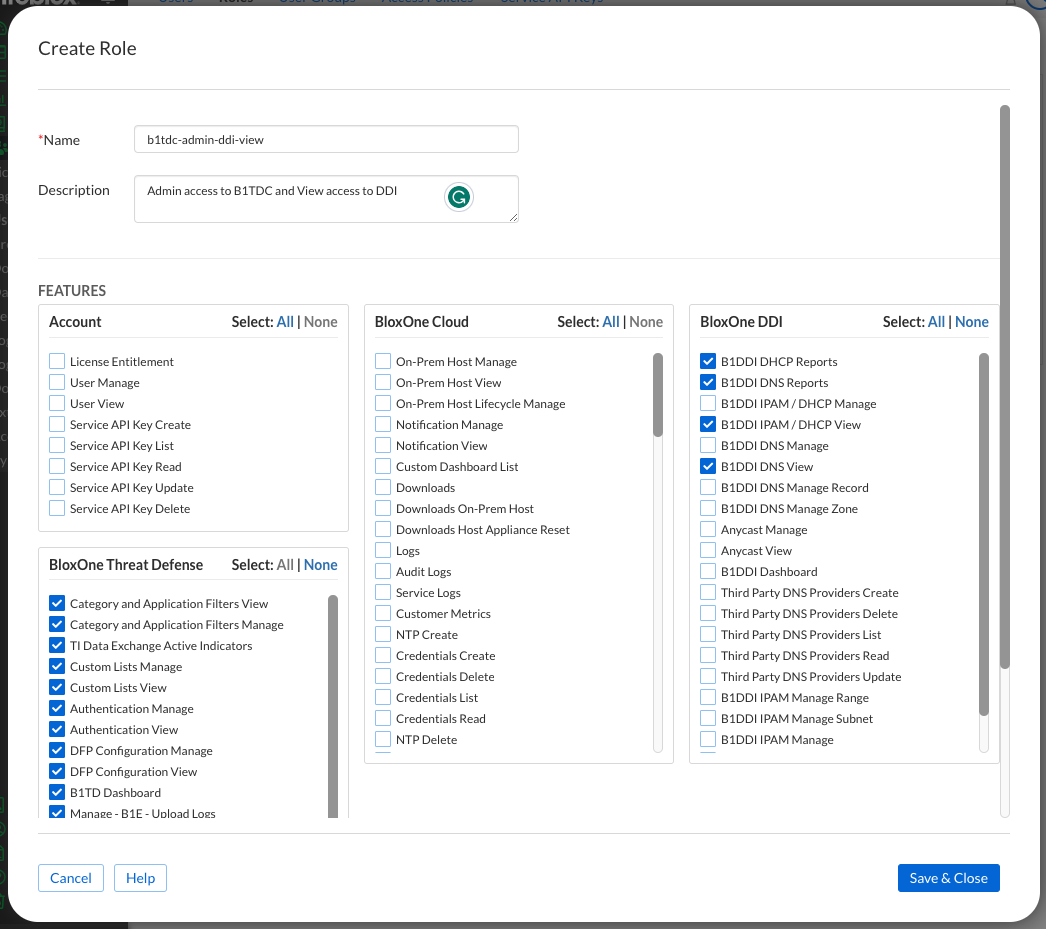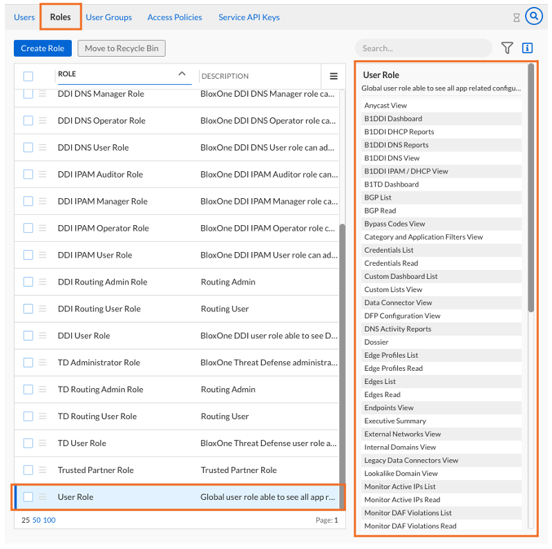 There are already some pre-configured roles in the BloxOne system. Find and examine these to get an idea of what Roles are available and what you may need in a custom role.