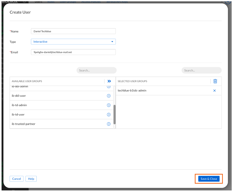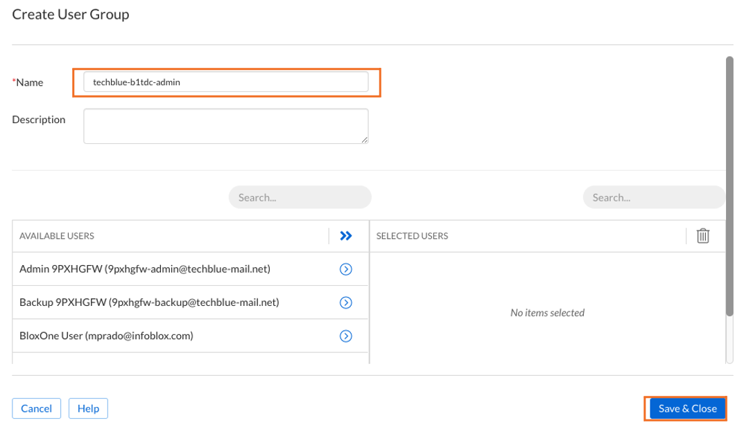 Name the user group techblue-b1tdc-admin and click Save & Close