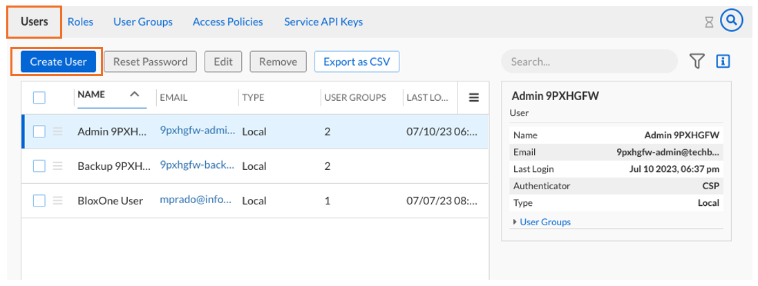Your Infoblox CSP admin lab login was provided in the Infoblox Education LMS. You have also been provided with user logins. We want to add the Daniel user to this user group. This user's email address name will be a combination of your lab user code and the name daniel. For example, Admin user 9pxhgfw-admin@techblue-mail.net will have a user available named something like 9pxhgfw-daniel@techblue-mail.net