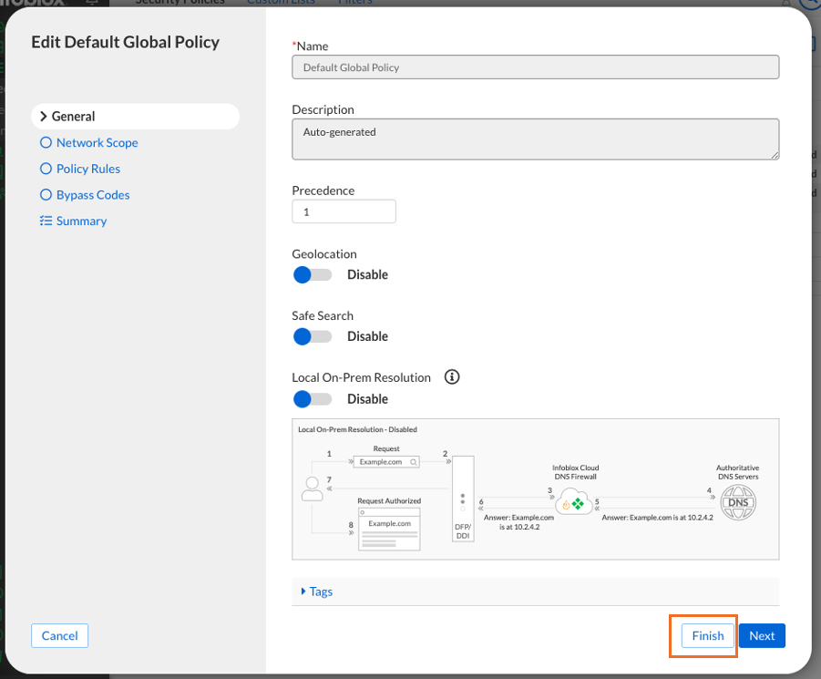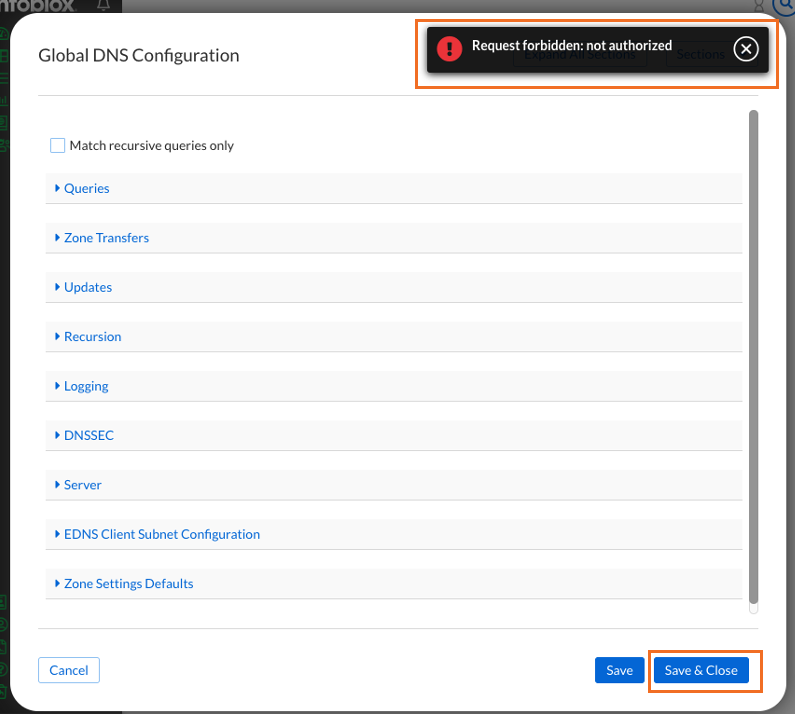 We are not making any changes, but we will test whether we can save a BloxOne Threat Defense Cloud change as this user. Click Finish and then Save and Close.