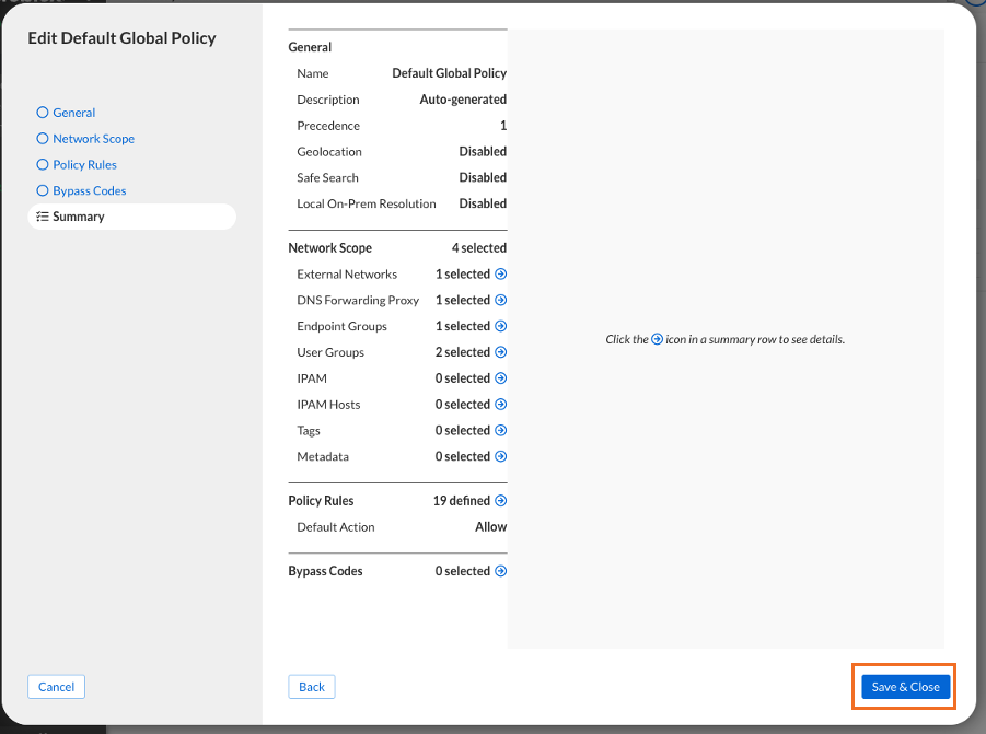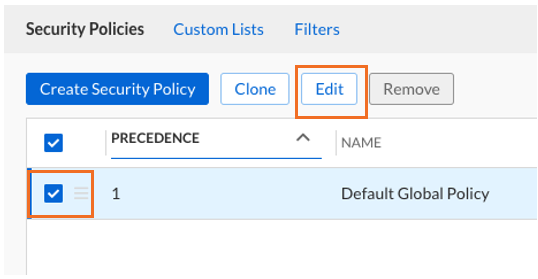 Edit the Default Global Policy by selecting its checkbox and clicking Edit