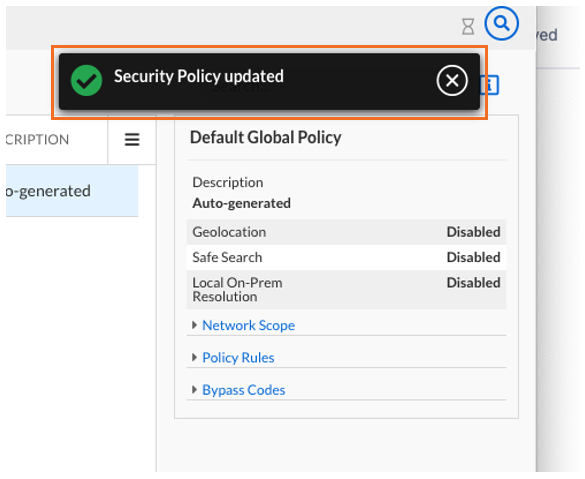 Notice the banner reporting a successful save. This means that this user can change this policy, which confirms the userβs permissions as a Threat Defense Cloud administrator.
