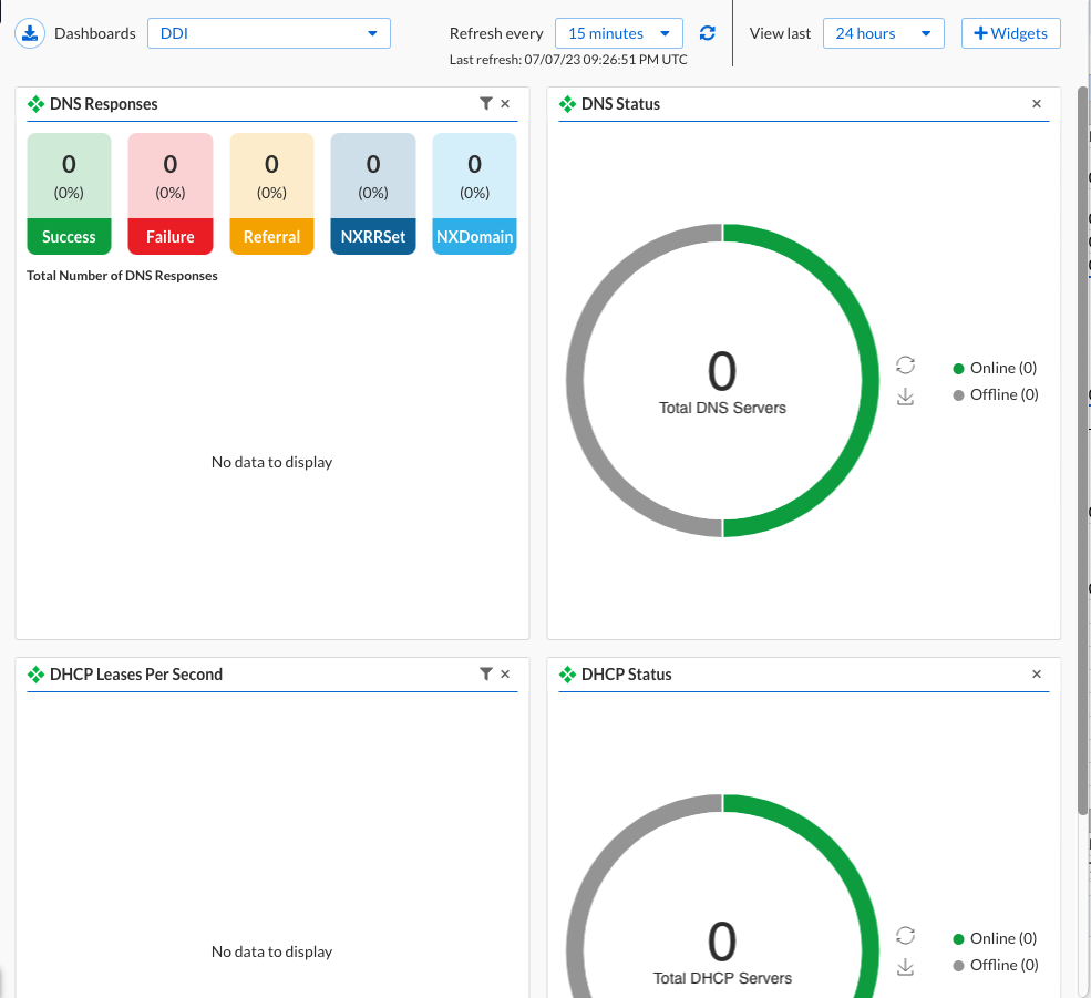 For your initial purposes, you only need to see DNS Responses, DNS and DHCP Status, and DHCP Leases Per Second. Remove the rest of the widgets in the DDI Dashboard.