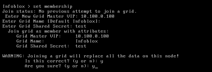 There are 2 parts of configuration for each NIOS appliance. The first part is changing the network settings or IP address on each NIOS appliance. The second part is instructing the NIOS appliance to join the Grid. Both can be done with one single command, set network (and answer Yes when asked to become a grid member). Or you can choose to run them separately, with set network (changing IP address), wait for the reboot, then execute set membership (joining the Grid). The example here shows how to perform the 2 parts separately, allowing you to validate the network connectivity before joining the Grid.