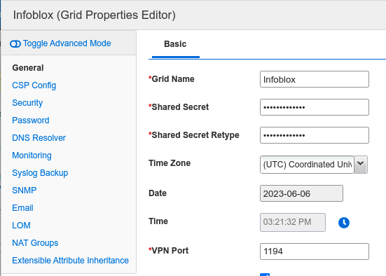 You can access the Grid Name and Shared Secret configuration by editing the Grid Properties. This is accessible in the GM web interface by selecting the Grid tab, and select Toolbar → Grid Properties → Edit. In the Grid Properties Editor, select the General tab, and you can see the Grid Name and Shared Secret configuration, as shown below.