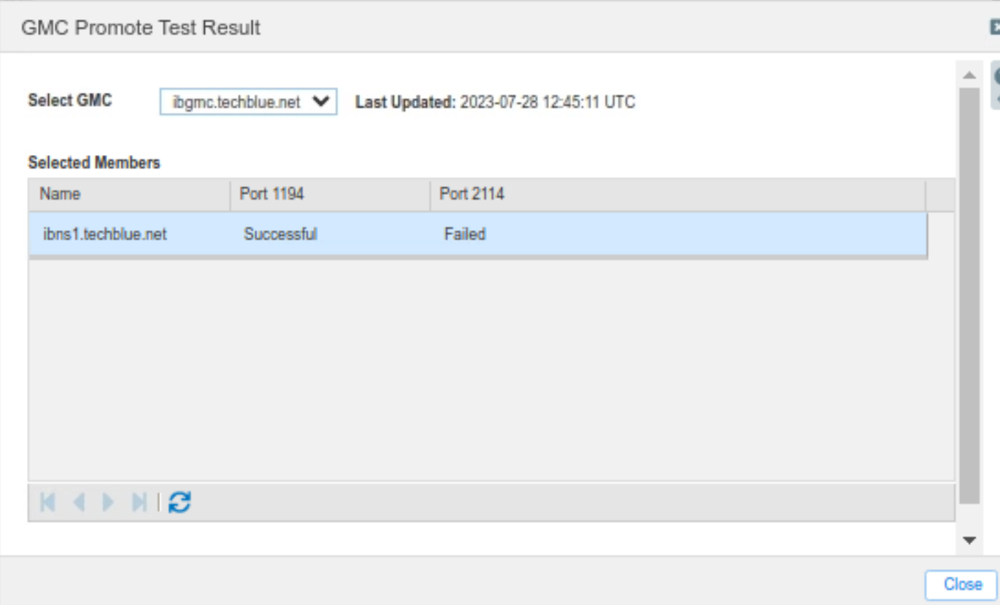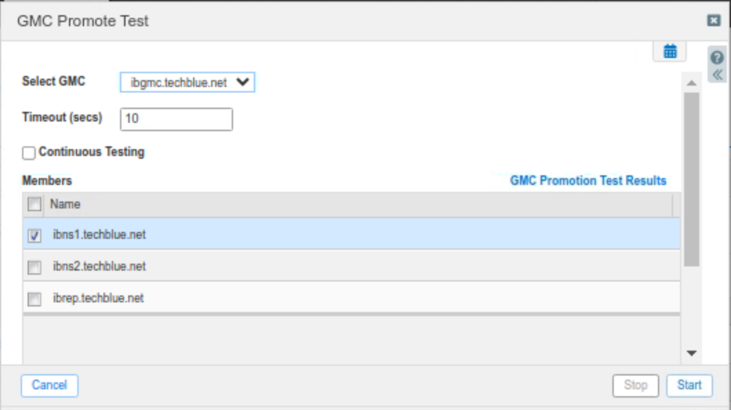 Select the GMC ibgmc.techblue.net, change the timeout to 10 seconds (so we do not wait as long), check the member ibns1.techblue.net, and click Start.