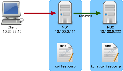 You are the DNS administrator of a small coffee company. Your company has recently started a new division for Hawaii's Kona Coffee. Before going public, your company is staging servers internally for the time being. The recursive resolver for the company is ADA (10.100.0.100). Your main DNS server NS1 (10.100.0.111) is authoritative for the internal zone coffee.corp. A delegation has been setup, to delegate the zone kona.coffee.corp to NS2 (10.100.0.222) located at the Hawaii branch office. An entry has already been added to NS2 for the new server, sweet.kona.coffee.corp. However, users are complaining that they are unable to resolve this name. Please analyze the information provided and find the root cause or root causes.