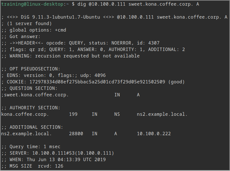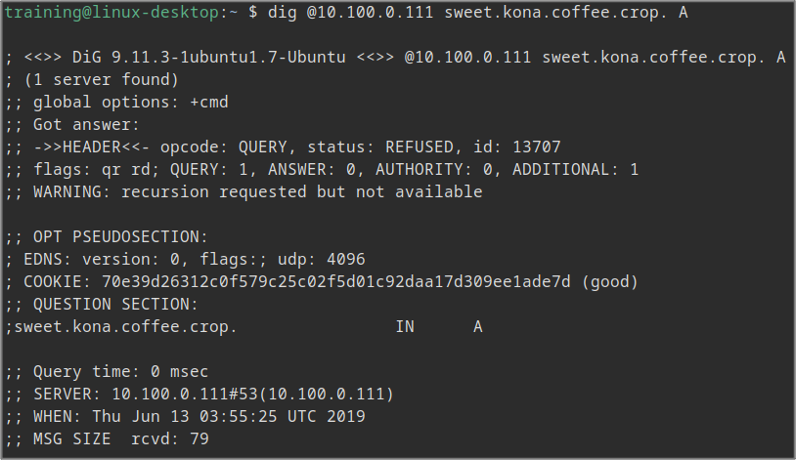 To test this, you may execute other queries against NS1 (10.100.0.111) to see if it accepts any other domain names, such as www.example.com. The root cause, however, is because the name was misspelled. The name server NS1 (10.100.0.111) is not authoritative for the coffee.crop domain name, and must resolve it using recursion. Since recursion is not enabled, we receive the REFUSED response code.