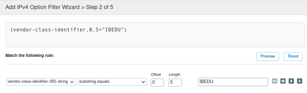 In Step 2 of 5 of the Add IPv4 Option Filter Wizard, We are matching for just the first five letters of Option 60, IBEDU, rather than the entire string, IBEDU.sauron-2022_10_21. You can certainly match for the entire string, especially if you are looking to match for specific model numbers. In our example here, this closely resembles matching for the make or product family, rather than the specific model.