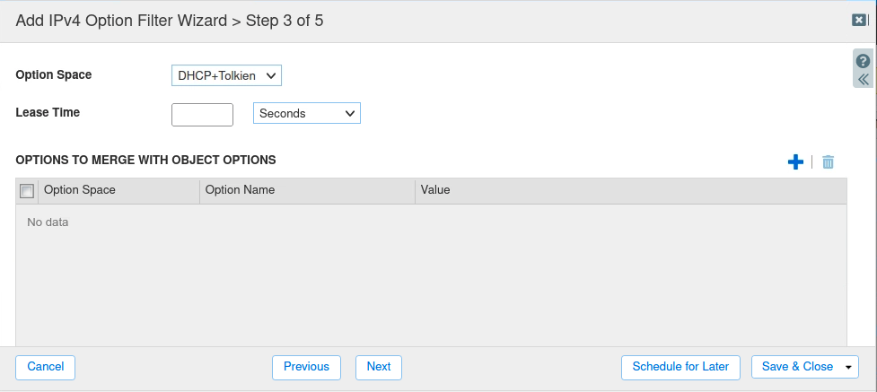 At Step 3 of 5 of the Wizard, in the Option Space drop-down menu, select DHCP+Tolkien.