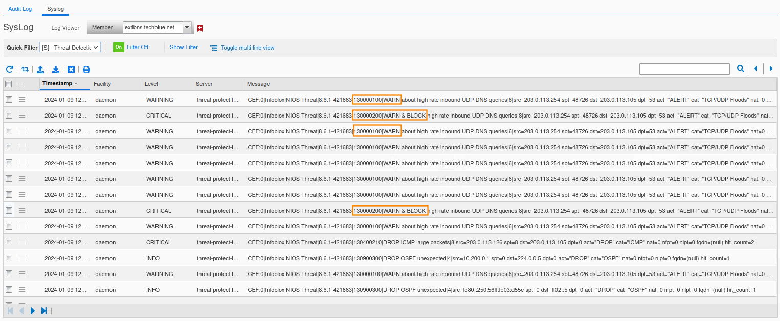 In this task, you will start your investigation on the ongoing DNS traffic spike triggering Threat Protection(ADP) to take action. We will start by investigating the Grid syslogs.